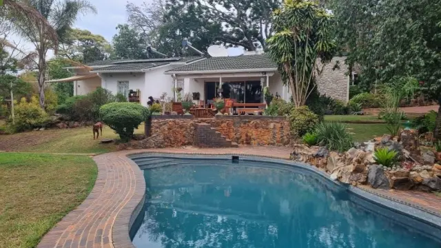 Gletwyn Park Northern Suburbs of Harare. This elegant double storey six-bedroom house features all ensuite bathrooms, with four upstairs bedrooms opening to a private balcony. It includes walk-in closets, a fitted kitchen with a walk-in pantry, a laundry room, and a scullery, alongside a neat dining area and three separate lounges. The property boasts a fountain and a well-kept garden, complete with an electric gate and a guard room for added security. It is equipped with CCTV for enhanced safety. Additional highlights include a triple lock-up garage, a separate garage, and paved surroundings. The home comes with a generator for backup power, a 5kVA solar power system, and a functional borehole. It also includes a storage container for reuse, a freezer, and two-bedroom staff quarters, featuring a garden with a fitted kitchen. Clean title deed available. Asking Price: US$950,000.